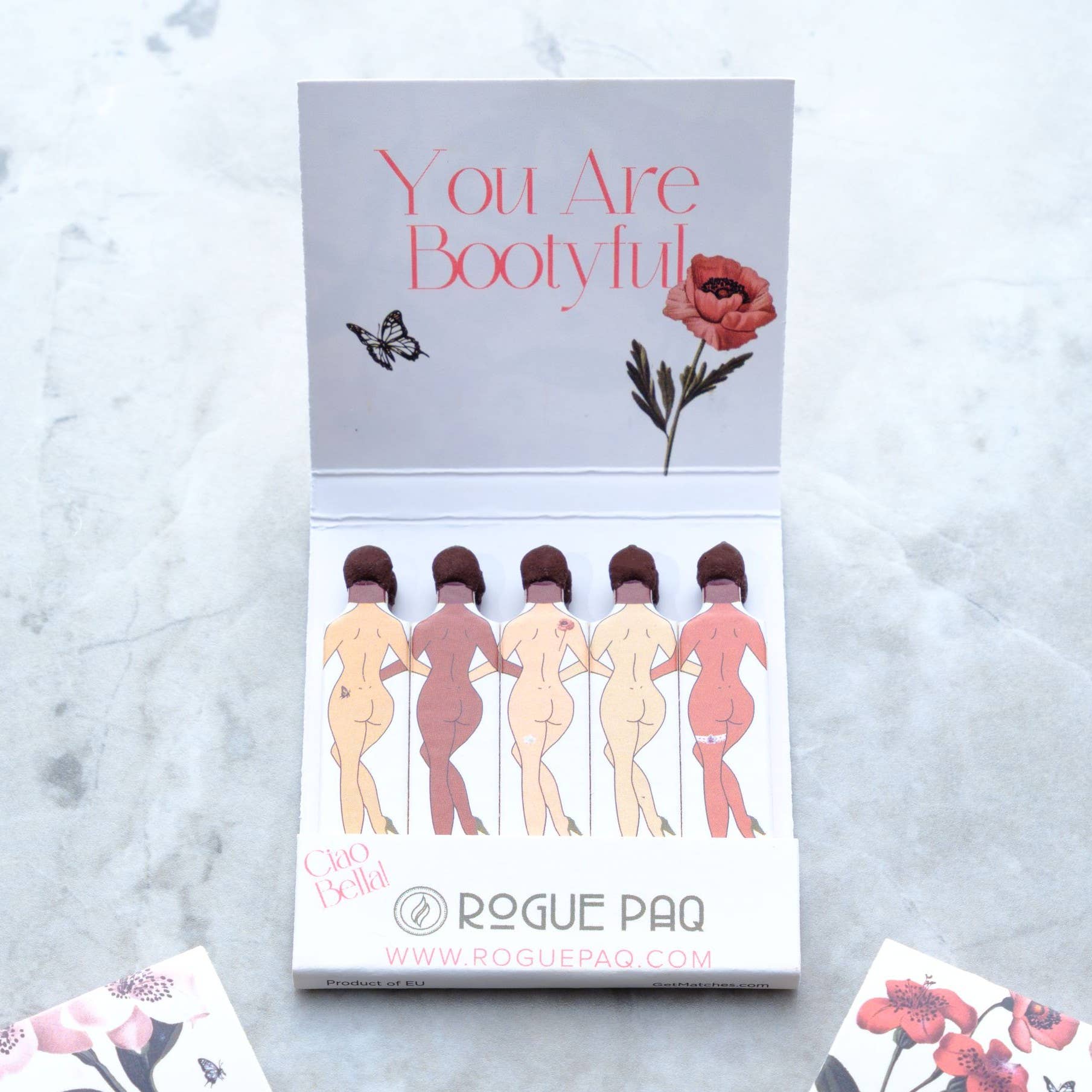 Matches in “You Are Bootyful” bring a cheeky touch to your shelves. Each matchbook features hand-designed nude silhouettes that celebrate body diversity.