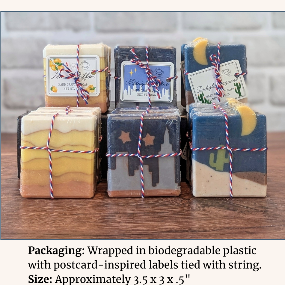 Scorched Horizon is inspired by the southwest's dramatic and colorful sunsets. Made with eco-friendly glitter, this soap sparkles like the sun. **Smells green and woodsy like agave, sea moss, cedarwood, and fir needle