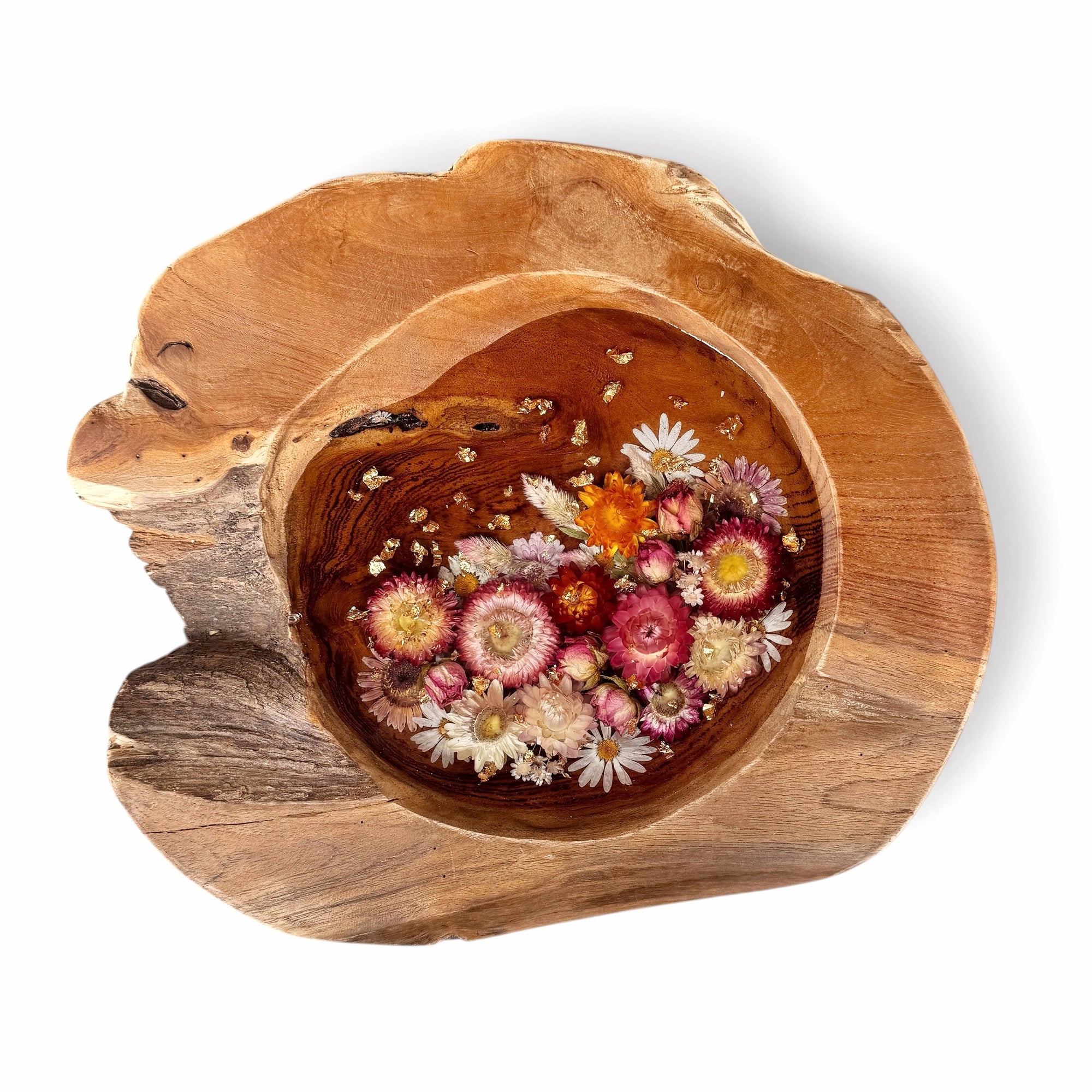 Resin center piece with wood base infused with gold specks and flower petals! Use it as a