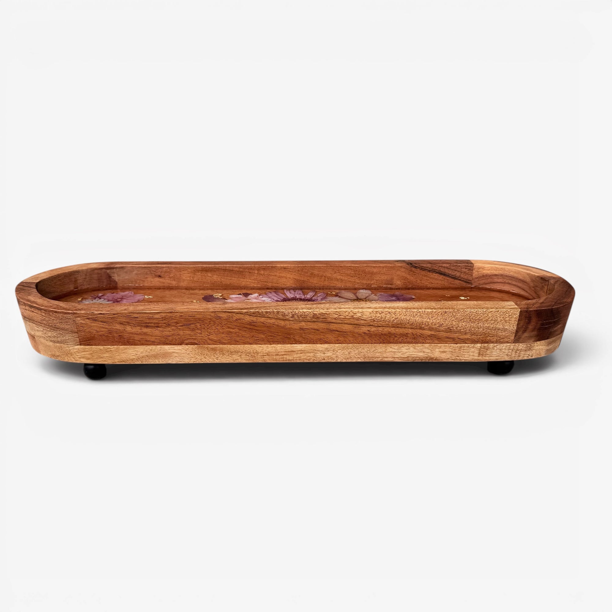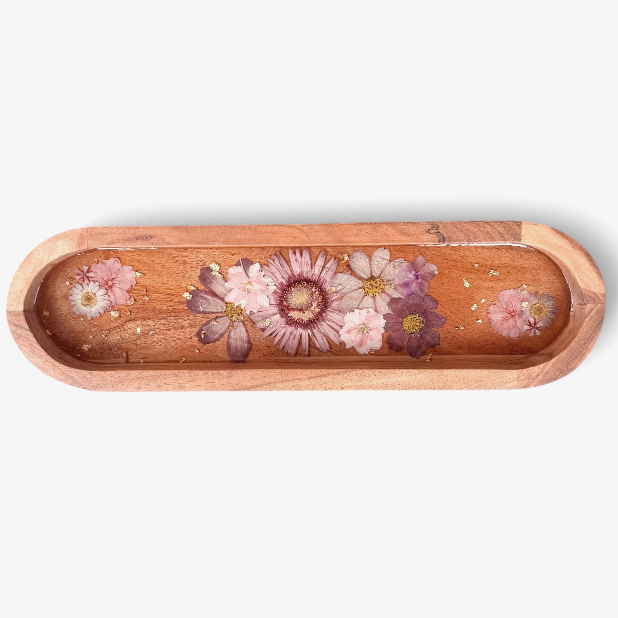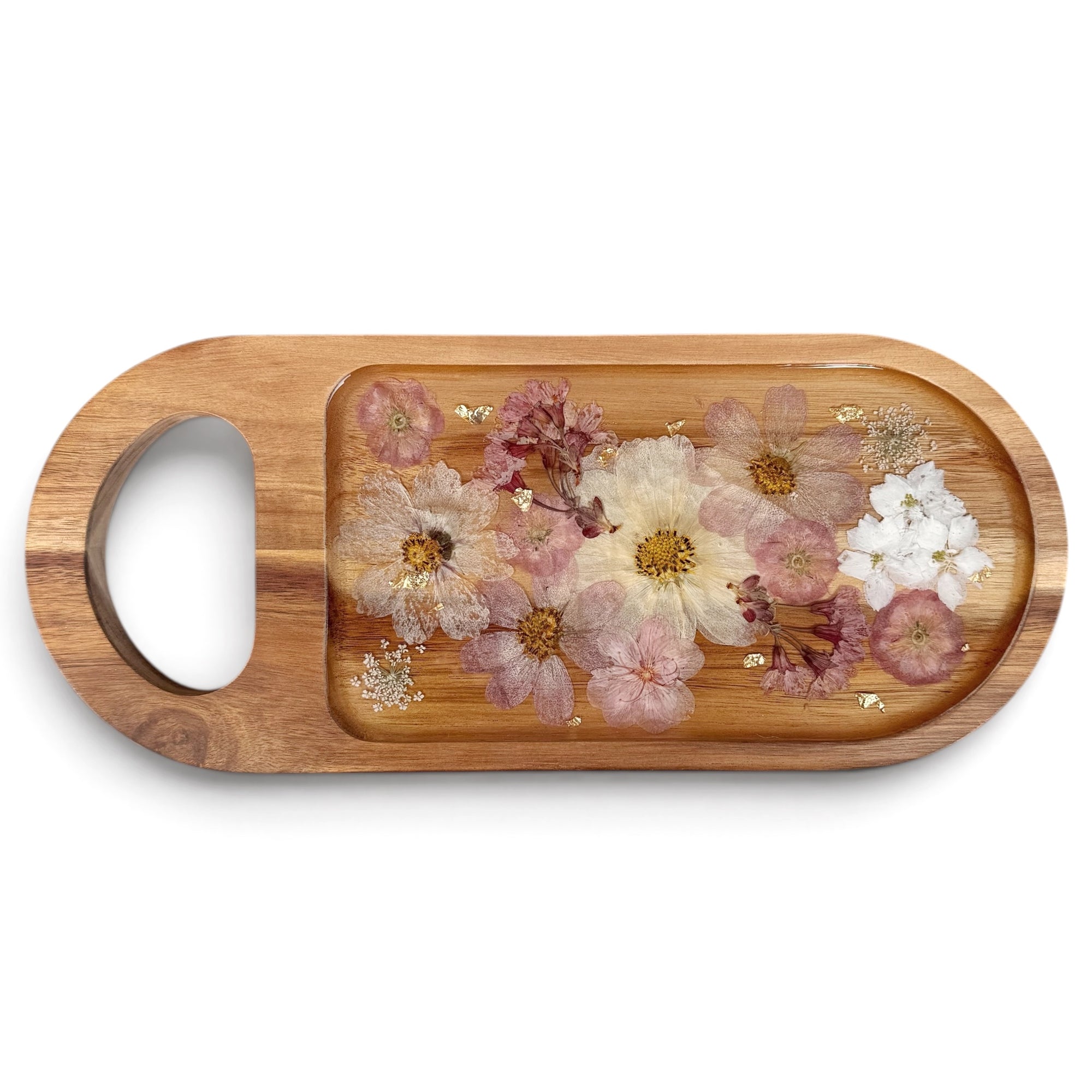 Resin board with wood base infused with gold specks and flower petals! Use it as a charcuterie board, display your jewelry or use just as decoration!