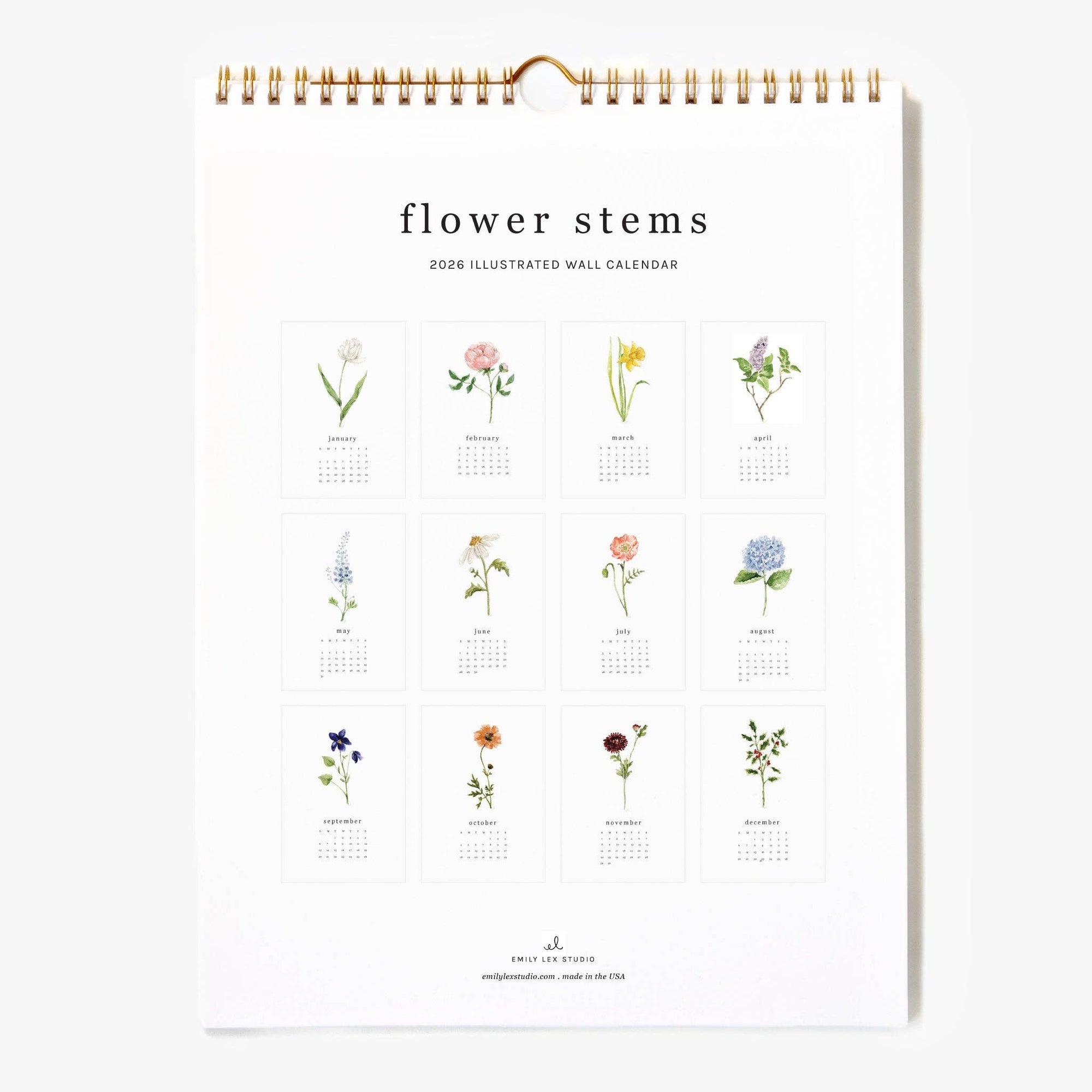 Enjoy a pretty flower stem for each month of the year! The Flower Stem Calendar features 12 watercolor flowers with the month and dates added for easy reference. The gold spiral binding and center notch makes hanging simple. Details:
